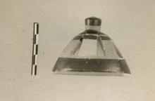 | Description: | Two joining fragments preserve the complete profile. Restored in plaster. Bell-shaped. Knob on top. Seven triangular openings on side. Exterior: horizontal bands of varying width alternately glazed and reserved. Interior reserved. Cf. P 16777. | |