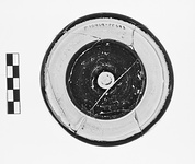 Good black glaze over all, except for the moulded outer part of the underside and a small disk at the center; in the latter, a glazed circle.