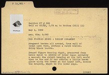 Description:   Fragment broken all around, from wall of large open vase, perhaps a calyx krater. Shiny black inside. Draped figure dancing right, preserved from waist to middle of lower legs, probably a maenad; the object hanging at the left would then be the end of her nebris; a little brown glaze along the break at the upper left, across the drapery, might be its lower edge.