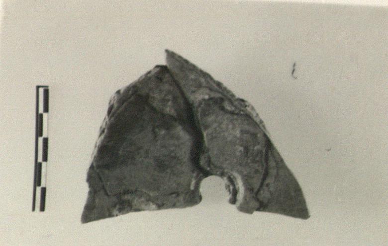| Description: | Two joining fragments, broken all around, preserving part of floor with low ring foot, and lower part of wall of shallow plate. In center of floor, a small round recessed area through which a hole has been cut. Soft pinkish-buff micaceous clay with tendency to flake; reddish-orange glaze thickly applied on exterior and tending to peel. Samian A. | |