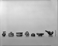 Description:   Foot, much of lower body and one handle preserved. A small pot with convex body, high slightly flaring foot, flat on bottom; horizontal handles, up-tilted. Traces of attachment on top of handle. Foot, handle and interior covered with thin brownish glaze. Body reserved and decorated with large and small dots of the same brownish glaze-paint.