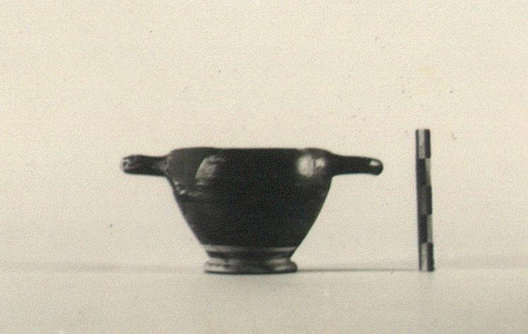 | Description: | About one-third of body missing and part of base; restored in plaster. Similar in shape and decoration to P 15979 (ΓΓ 655), but smaller. Dull black glaze fired to brown and greenish-brown around lower half of vase (as a result of stacking). ADDENDA P 15979: Shape similar to P 15975 (ΓΓ 651), but smaller. Inside of handles not reserved; a single purple band near handles. A broad purple band on a reserved area just above foot replaces the rays. Upper surface of foot reserved, and space inside foot, with no circles. P 15975: Substantial cup, little drawn in at rim. Rather thick foot, coarse "rays" on reserved band above foot. | |
