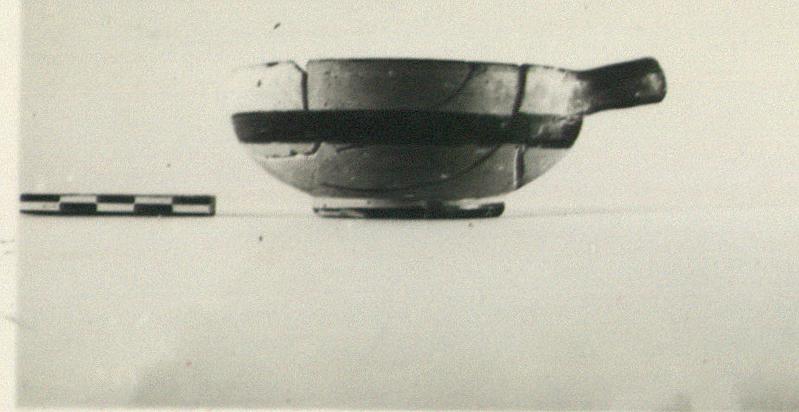 | Description: | About one-quarter of base and body missing; restored in plaster. Solid disc-like foot, glazed on outer edge, reserved on under-surface. Wall rises to plain unthickened lip. Horizontal strap handle glazed on outside, reserved inside, set at rim. Exterior reserved except for broad band just below handle. Inside and lip glazed; a reserved disk at center of floor. Dull glaze. | |