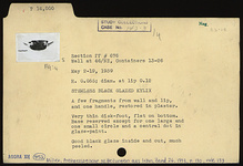 Description:   A few fragments from wall and lip, and one handle, restored in plaster. Very thin disk foot, flat on bottom. Base reserved except for one large and one small circle and a central dot in glaze-paint.