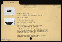 | Description: | A few fragments missing from wall and lip; restored in plaster. Small bowl on disk foot, slightly concave. Low flaring straight wall; thickened lip turned slightly inward and curving down to meet wall at oblique angle. Heavy fabric; good black glaze; bottom reserved; red wash prominent. | |