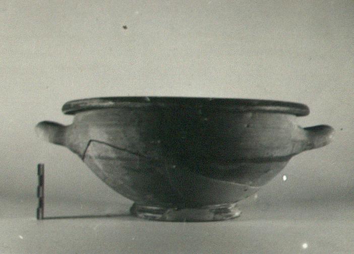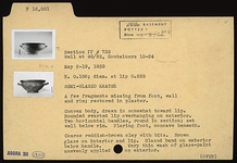 | Description: | A few fragments missing from foot, wall and rim; restored in plaster. Convex body, drawn in somewhat toward lip. Rounded everted lip overhanging on exterior. Two horizontal handles, round in section, set well below rim, Flaring foot, concave beneath. Coarse reddish-brown clay with bits. Brown glaze on interior and lip. Glazed band on exterior below handle. Very thin wash of glaze paint unevenly applied on exterior. Fragments of other semi-glazed kraters to be found in most storage tins of this well, particularly in T 536, T 539, T 546. | |