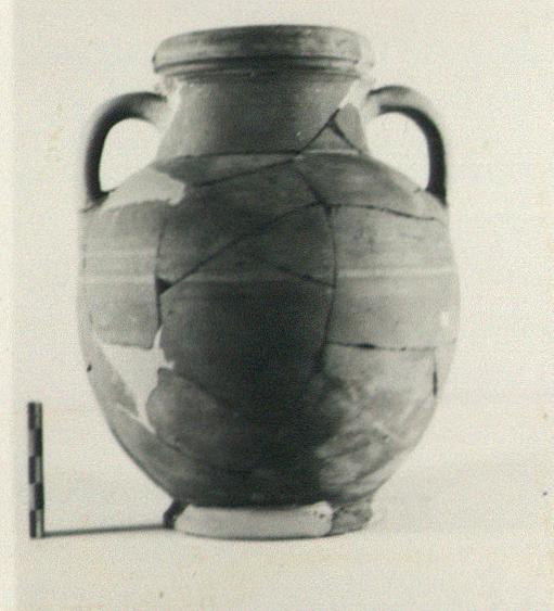| Description: | Much of foot and body, half of neck and lip, and both handles missing; restored in plaster. Flaring ring foot; ovoid body with maximum diameter just below handles; narrow shoulder, wide vertical neck; rim thick, high, rounded, with a sharp ridge just below it. Vertical handles from shoulder to below lip. Very micaceous red clay with bits. A few traces of glaze or decoration remain: on the lip, red glaze(?); around the body, just below the handle attachments, five bands, alternating red and dull white; above the foot another red band. Traces also of red around one of the handle attachments. Perhaps non-Attic? | |