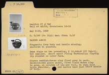 | Description: | Fragments from body and handle missing; restored in plaster. Same shape as P 16058, P 16059 (ΓΓ 740, ΓΓ 741), but smaller. Short spout rising vertically; flaring lip rounded on outer face. Coarse reddish-brown clay fired gray in part. Brownish-red glaze-paint, fired black where clay is gray, on outside of lip and foot, in wide band below shoulder, and narrow band just below middle of body. ADDENDA P 16058: Fat body with flaring wall on flaring ring foot. Body completely covered with low convex top. From top near shoulder rises a spout. A vertical arching handle is attached to top just behind spout and to shoulder at point opposite to the spout. | |
