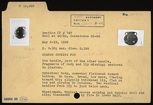 | Description: | One handle, part of the other handle, fragments of body and lip missing; restored in plaster. Spherical body, somewhat flattened toward bottom. No base. Broad, low neck, flaring toward top; slightly thickened lip, flat on top and sloping to outside. Two vertical handles from lip to just below neck. Typical coarse cooking pot fabric; dull red slip; blackened by fire in lower half. ADDENDA Possibly a Palestinian import? See Crowfoot, et al, Samaria-Sebaste III, p. 130, fig. 12, nos. 11-12 (period VIII, 7th.-6th. c. BC) and p. 229, fig. 41, no. 1 (Hellenistic). Our piece by shape possibly between the two dates (GRE). | |