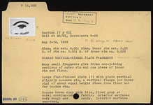 Description:   Many small fragments give three non-joining sections of outer rim and one piece of inner rim and floor. Large flat-floored plate(?) with plain vertical slightly concave rim, a vertical flange (or inner rim) of about equal height rises from floor not far inside rim.