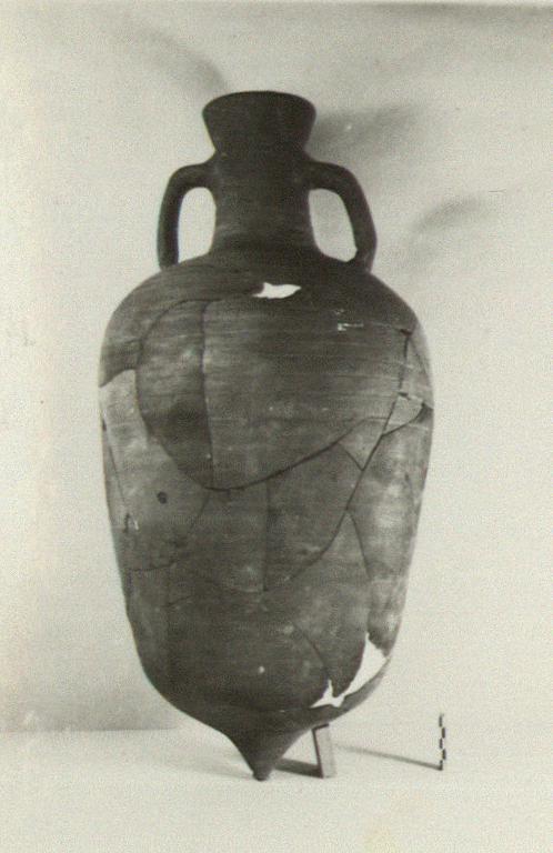 | Description: | Small fragments of body missing; restored in plaster. Somewhat warped and discolored in firing. Flaring mouth, narrow neck, horizontal grooves on upper part of elongated ovoid body. Rounded bottom ending in short blunt point. Short handles from below lip to upper part of shoulder. Brownish clay; unglazed. Cf. P 11748. | |