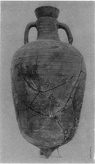 Description:   Small fragments of body missing; restored in plaster. Somewhat warped and discolored in firing. Flaring mouth, narrow neck, horizontal grooves on upper part of elongated ovoid body. Rounded bottom ending in short blunt point. Short handles from below lip to upper part of shoulder.