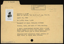 | Description: | Handle, base, and much of body missing. A small round-bodied pitcher with a round mouth higher in front than behind. Handle from just below lip to below shoulder. Brownish-buff micaceous clay; remains of dull black to brown wash outside. | |