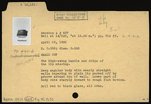 | Description: | The high-swung handle and chips of the lip missing. Deep angular body with nearly straight walls tapering to plain lip marked off by groove around top of wall. Lower part of body cuts sharply inward to rough flat bottom. Dull red to black glaze, all over. | |