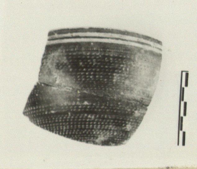 | Description: | Two joining fragments preserve part of rim and much of profile of body. Two reserved grooves just below plain rim on exterior; the rest of the exterior is covered with horizontal bands of rouletting, irregularly spaced. Dull black glaze inside and out. | |
