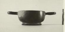 Description:   Fragment of rim missing. Plain rim; elongated, horizontal handles. Straight sides; ring foot. At center of floor a small impressed circle about which four impressed palmettes.