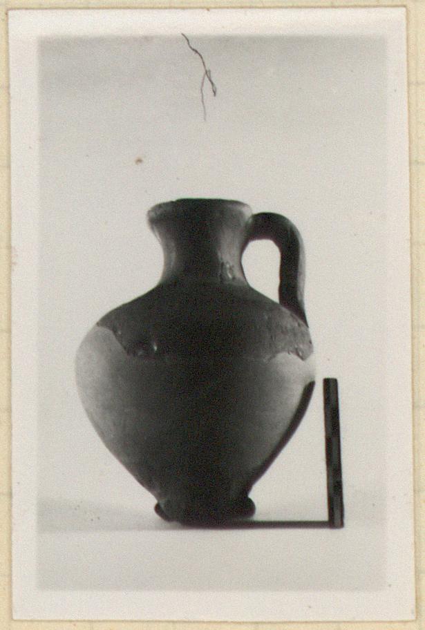 | Description: | Mended from several fragments. Top and bottom parts do not join; put together with plaster. Round mouth with thickened flaring lip. Narrow neck; single vertical handle. Broad eggy body, tapering below to blunt point. Buff to reddish clay, unglazed; heavy fabric. | |