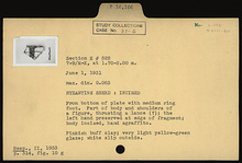 | Description: | From bottom of plate with medium ring foot. Part of body and shoulders of a figure, thrusting a lance(?) the left hand preserved at edge of fragment; body incised, hand sgraffito. Pinkish-buff clay; very light yellow-green glaze; white slip outside. | |