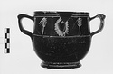 | Description: | One handle and fragments of rim and body missing; restored in plaster. Shape as P 16238 (ΕΕ 414), but the lip less rounded, and with two scraped grooves below it. Ivy leaf on handle. West slope decoration as P 16238 (ΕΕ 414), but without the dot rosettes. ADDENDA P 16238: More or less cylindrical body, narrowing slightly toward top. Profiled ring foot. Plain rim, rounded, a scraped groove below it outside; a second scraped groove at the line of the lower handle attachments. Vertical band handles with plastic masks. West slope decoration on upper part of body, between the two grooves: a wreath between ears of grain, a dot rosette either side of the wreath; pairs of streamers beside the handles. | |