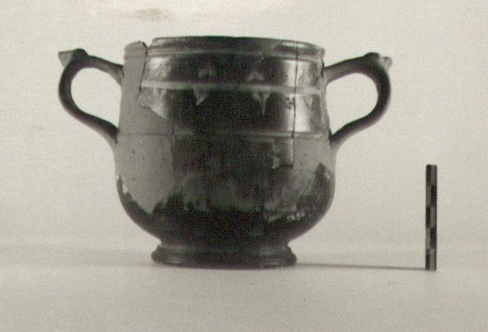 | Description: | Both handles and some of rim and body missing; restored in plaster. Shape as P 16239 (ΕΕ 415), but smaller; one groove below the lip scraped, the other not. Ivy on upper part of body: stem and leaves yellow, berries white. Glaze black to dark brown. ADDENDA P 16239: Shape as P 16238. P 16238: More or less cylindrical body, narrowing slightly toward top. Profiled ring foot. Plain rim, rounded, a scraped groove below it outside; a second scraped groove at the line of the lower handle attachments. Vertical band handles. | |