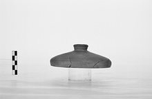 Description:   About half of rim missing; restored in plaster. Domed lid with plain rim, deep and slightly in-turned. A groove around the outer edge of the top. Rather broad knob with concave top.