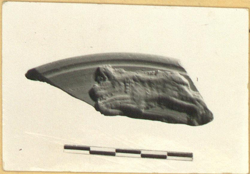 | Description: | Wide Late Roman A rim with heavy moulded edge on which animal (lion?), in relief, galloping to left. Fine red clay; red wash. | |