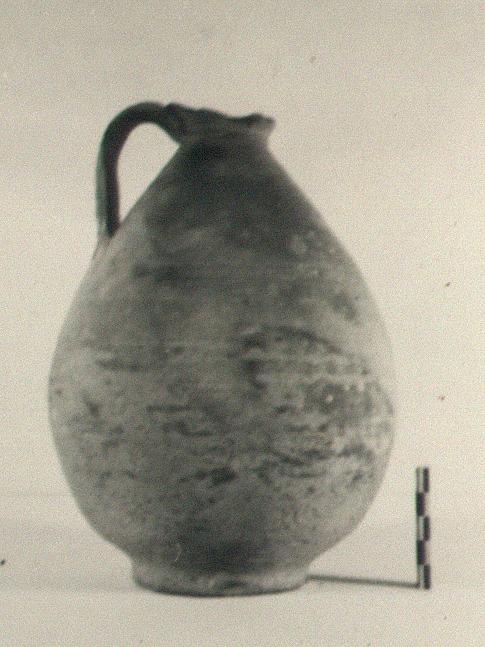 Description:   Lip broken away; otherwise intact. Deep body on ring foot; no shoulder. Narrow neck with flaring lip; vertical strap handle. Body lightly ribbed in lower part and marked by two grooves just below lower handle attachment.