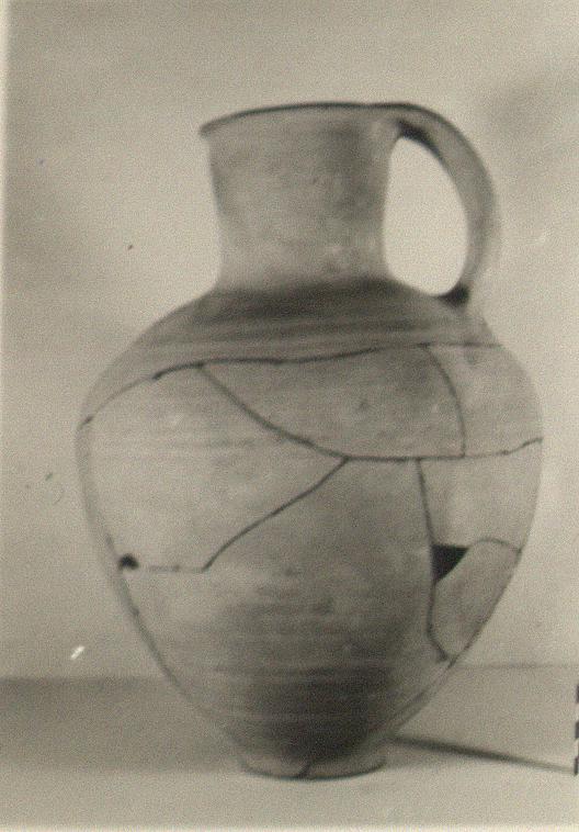 | Description: | A few fragments missing from body. Plump body narrowing gradually to small disc-like foot, the base of which is recessed toward the center. Body and shoulder form a continuous curve. Broad vertical neck with flat lip projecting slightly to exterior. Single vertical strap handle from lip to shoulder. Firm buff to reddish-buff clay with some mica. | |