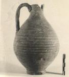 | Description: | Upper part of neck missing. Ovoid body with point of maximum diameter below the middle, narrowing sharply to a small ring foot. No shoulder. Very narrow slightly flaring neck. Single vertical ribbed handle. Upper two-thirds of body lightly ribbed. Micaceous tan clay with bits. Dull purplish-red paint on upper two-thirds of pot. | |