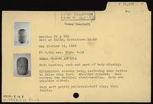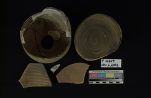 | Description: | Both handles, neck and part of body missing. Cylindrical slender body, narrowing near bottom to false ring foot. Shoulder rounded. Neck narrow; two vertical strap handles. Body and shoulder ribbed. Very soft gritty yellowish-buff clay; thin fabric. | |