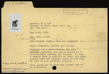| Description: | Small fragment, broken all around; from near center of closed end. Inside unglazed, and shows traces of a protuberance marking the center. On top, a female face in profile to left, the face placed over the central point. To left of the profile, scrolls. | |