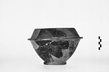 | Description: | Most of rim and part of body missing; restored in plaster. Heavy base ring rounded on exterior; steep flaring slightly convex wall separated from the straight inward-sloping rim by a horizontal flange. Reddish-buff clay; fair black glaze with metallic lustre in spots applied over all. | |