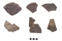 | Description: | Sixteen fragments, some consisting of several joined pieces, of a basin similar to P 3310 (Γ 374). The pot is not sufficiently whole to deserve restoration at present: a) part of base of wall, b) spout, c) handle, d) wall with pie-crust decoration. The preserved fragments give part of handle and of base, part of wall, and the spout almost complete. Rim missing. From a flat-bottomed basin with almost vertical walls and a large spout with flaring lip, springing from wall below rim. Horizontal handles, round in section. A raised ridge with pie-crust indentations around the wall below the rim. Pinkish-buff clay; thin dull glaze varying from black to purplish-brown on interior and on upper part of exterior. | |