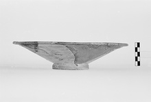 | Description: | About half of plate and foot missing; restored in plaster. Narrow ring foot, flaring straight wall with plain horizontal lip set off from wall on interior by a slight groove. Reddish-brown clay; dull glaze on interior and on part of exterior, fired black to purplish-brown; red at center of floor from stacking. | |