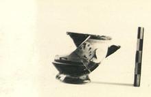 | Description: | About half the rim and wall missing, with one handle and all but a stub of the other. Skyphos with thickened roughly profiled lip and high heavy ring foot. The broad reserved handle zone was in part covered with a white ground which carried the decoration. Of this the only certain remains are a palmette beside the handle and what appears to be the foot of a cloaked figure. No incision. Also reserved, the insides of the handles, the resting surface, and the space inside the foot. | |