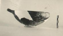 | Description: | About one-third of the rim and wall missing; restored in plaster. Small roughly made straight-sided ring foot; flaring walls rounding in towards the top and finished with a flat lip which projects slightly towards the outside and slopes down rather sharply towards the inside. Stubby handle set at rim and slightly up-tilted. Hard light red clay, moderately fine. Thick dull glaze wash, red to black inside and out, carelessly applied outside so that it does not reach to the foot evenly all around. A coarse version of the conventional one-handler; cf. P 16480 ff. | |