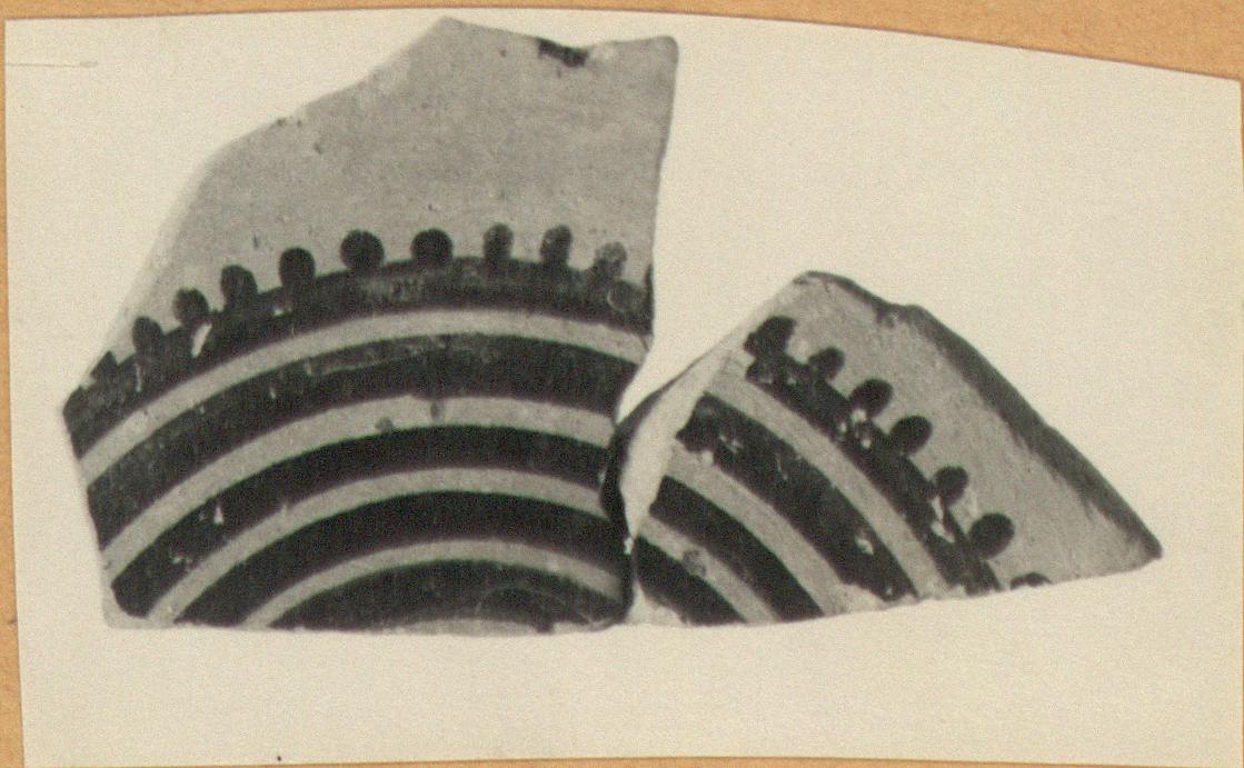 | Description: | Fragment from base. Decorated with concentric circles edged by dots inside and out. The type of pyxis decorated inside and beneath appears to belong to a more advanced stage than those hitherto listed. | |
