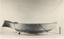 | Description: | Rather more than half of a well made mortar, with collar rim, rounded on top, large semi-circular spout, and high base, flat beneath. Corinthian coarseware fabric, slipped with fine buff, and thickly covered on floor with broken up grits to form an abrasive surface. | |