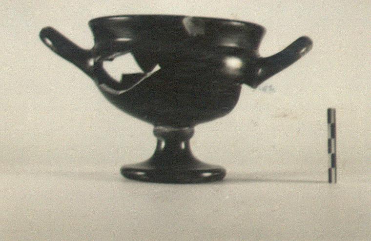 | Description: | Fragments of wall and chips from rim missing. A deep round-bodied cup with straight flaring rim, the bowl separated from the substantial stem by a heavy moulded ring painted in added purple. The stem and foot form a continuous curve; the edge of the foot is rounded, the underside slopes upward to a hollow cone. Heavy up-tilted handles, rounded at the ends, set on wall just below rim. Very good black glaze; the underside within the foot reserved. | |