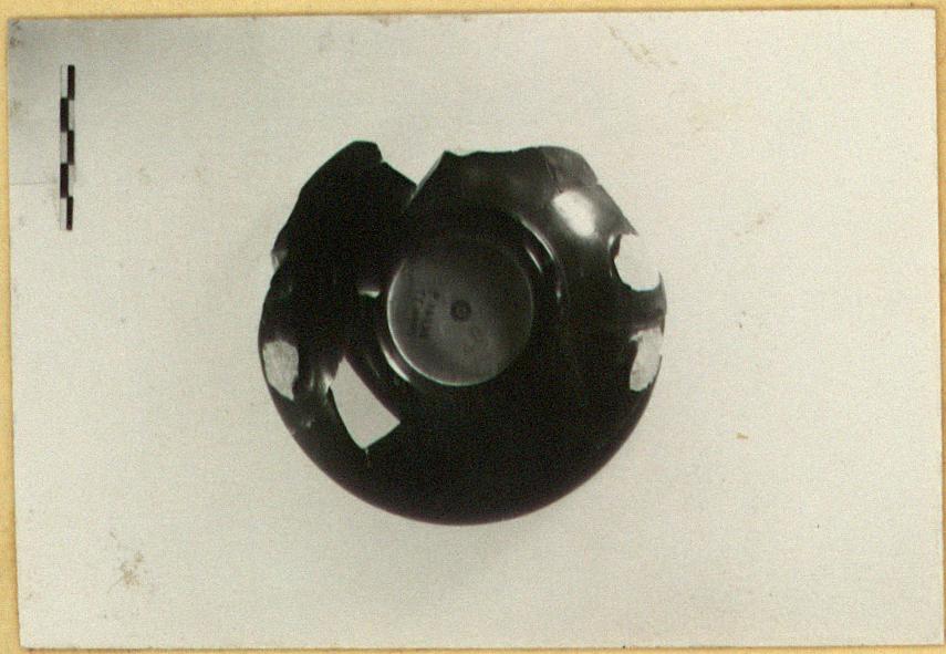 | Description: | Both handles broken away and about half the rim, with a little of the walls, missing. Plain rather small cup on plump ring foot. Excellent black glaze over all except within foot; dot and small black circle. | |