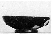 | Description: | Both handles broken away and about half the rim, with a little of the walls, missing. Plain rather small cup on plump ring foot. Excellent black glaze over all except within foot; dot and small black circle. | |