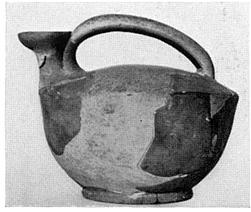 | Description: | Lip and handle broken away, and much of the body and lip missing; restored in plaster. Shape and size much as the glazed askos P 16456 (ΓΓ 911), but the wall more spreading, the shoulder angle sharper and the top domed. Projecting vase, slightly concave beneath. Fine soft pinkish clay, buff on the outer surface. | |