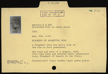 | Description: | A fragment from the wall; none of the rim or foot preserved. The head and neck of a dragon, left, with open jaws and crested head; imbricated body; fragment of branch in the field. Pinkish-buff clay; uneven light green glaze. | |