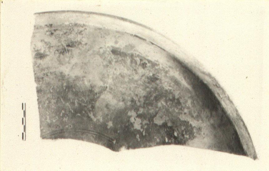 | Description: | Single fragment preserves about half of circumference and profile to within foot. Flat-floored platter with extremely low ring foot. Low nearly vertical rim. Soft gray clay with some mica; dull black glaze over all, much worn. The fragment appears to have come in contact with fire. | |