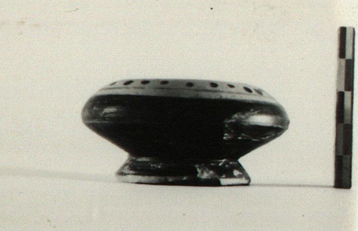 | Description: | Intact except for small chip from foot. High flaring foot and sharply curved body with downturned rim inside. No handle. Glaze to shoulder, which is reserved and decorated with a dot row between narrow lines. Inside glazed. Pinkish-buff Attic clay; glaze black to reddish-brown. | |