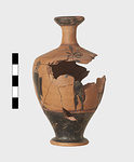 | Description: | Mended from many pieces; fragments of body and shoulder missing. Similar in shape, size and decoration to P 16587 (ΝΝ 1713). Purple: ground line, band at base of neck, two bands on lip. Good black glaze, quite metallic; no traces of burning or peeling. | |