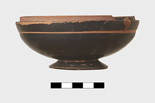 | Description: | Intact, save for chip from rim. High flaring ring foot and rounded body; reserved groove outside below rim; upstanding inner rim to hold lid. Black glaze all over except: bottom of bowl inside foot, resting surface of foot, groove below rim, and upper surface of rim and outer face of inner rim, both the latter painted purple. Double band of purple around center of floor; another pair of purple bands halfway to rim inside. | |