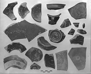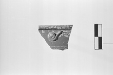 | Description: | Spiral coil in relief beneath moulded rim. Narrow raised band marks lower edge of rim. Rim vertical and seems to have projected slightly from body of vase. Fine light red clay; good thick red glaze inside and out. Western Sigillata. | |