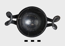 | Description: | Foot with center of floor, one handle and part of wall missing. Restored in plaster. Squat kantharos with rounded lower wall, straight upper wall and heavy rim giving a doubled-over effect. High-swung cup handles, the bent-over top curving in towards the rim. A band of rouletting on the floor. Firm dull black glaze, worn on the handle. Cf. Agora XII, no. 661. | |