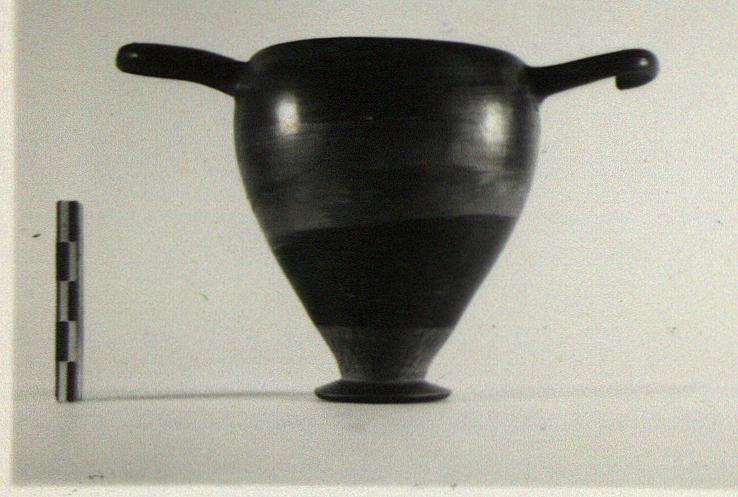 | Description: | Fragment of rim and part of one handle missing. Eggy body, the rim drawn in, the walls tapering sharply toward the bottom. Flaring ring foot. The handles spread considerably from their attachments. Firm dull black glaze, the upper part outside mottled gray from stacking. Crisscross rays on reserved band above foot. Also reserved: inner edge of rim; handle spaces and insides of handles; space within foot, this with a glazed circle at its edge. Cf. Agora XII, no. 326. | |